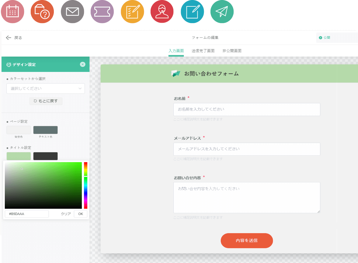 Tayoriは入力項目のカスタマイズ性が高いだけでなく、自然にWebサイトへ組み込めるように、デザイン面でも設定の自由度が高くなっています。